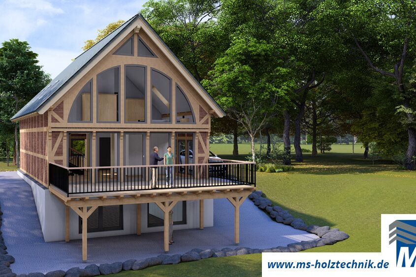 Dieses Fachwerkhaus hat ein Aussenmaß von 12,00 x 6,70 Meter und ist als Wohnhaus konstruiert. Die Möglichkeit den Giebel komplett verglast zu gestalten ist das Highlight dieses Bausatzes und schafft helle Räume und einen tollen Ausblick. Bauen mit traditionellen Baustoffen wie z.B. Eichenholz ist nachhaltig und schafft ein gesundes Raumklima. In ein solches Baukonzept passt optimal unser Fachwerkhaus als Bausatz-Variante. Insbesondere handwerklich begabte Bauherren profitieren von unserem vergleichsweise günstigen Bausatz. Ab 53.519,- Euro inkl. MwSt. erhalten Sie bei MS Holztechnik einen Fachwerkhaus Bausatz den Sie optimal als Wohnraum nutzen können.